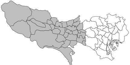 小平市、国分寺市、小金井市、三鷹市、武蔵野市、府中市、立川市、国立市、八王子市、町田市、調布市、西東京市、多摩市、東久留米市、清瀬市、東村山市、昭島市、東大和市、日野市、青梅市、福生市、稲城市、武蔵村山市、羽村市、あきる野市、狛江市 、奥多摩町、桧原村、日の出町、瑞穂町